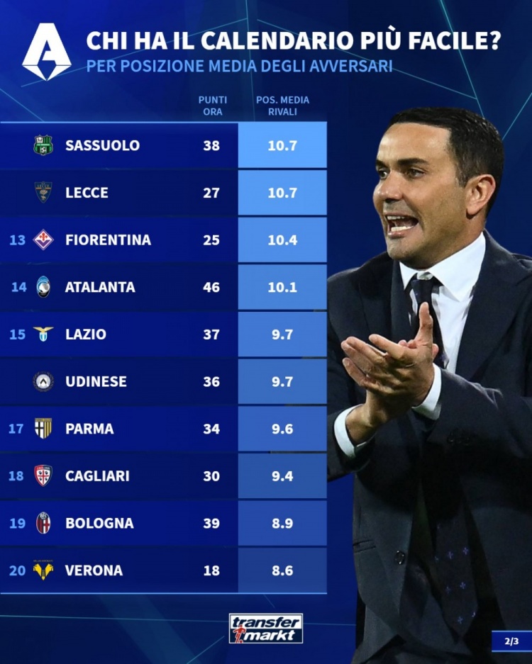 3月11日讯 德国转会市场统计了意甲各队剩余10轮对手的平均排名,并列出榜单,尤文的对手平均排名最低。