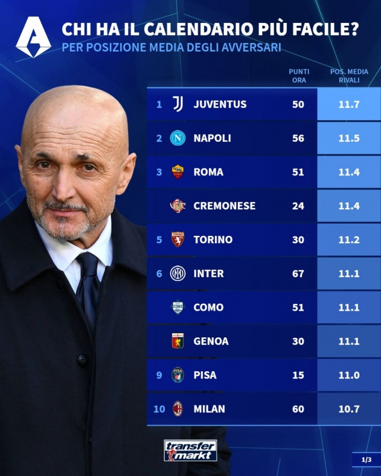 3月11日讯 德国转会市场统计了意甲各队剩余10轮对手的平均排名,并列出榜单,尤文的对手平均排名最低。